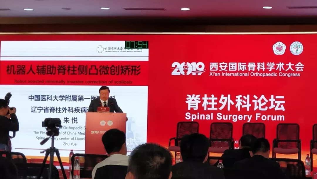 在脊柱外科論壇中,中國醫科大學附屬第一醫院朱悅教授做了題為《機器人輔助脊柱側凸微創矯形》的主題發言。他指出,目前骨科手術機器人已應用到關節外科、運動醫學、創傷領域及脊柱外科等學科中,他以中國醫大一院完成的國內首例天璣?骨科手術機器人聯合可彎曲錐體后凸成型系統治療骨質疏松性椎體壓縮骨折的手術為例,高度肯定了天璣在骨科手術中的作用。天璣作為國際上唯一能夠開展脊柱全節段(頸椎、胸椎、腰椎、骶椎)的骨科手術機器人系統,在手術過程中充當著骨科手術醫生的“第三只手”,充分發揮了智能、精準、微創的優勢,結合可彎曲椎體后凸成型系統,給術者的操作帶來更大的方便,提高了手術效率,也給患者帶來了更加的術后效果。
